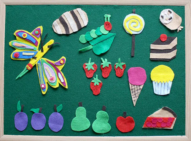 This is a felt storyboard inspired by the book *The Very Hungry Caterpillar*.