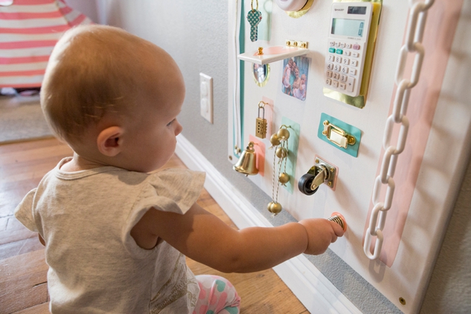 The benefit of this DIY toddler busy board: Develops dexterity and coordination while having fun.