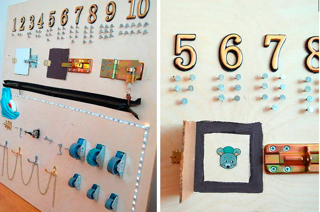That is a wonderful DIY setup! The use of physical hardware like latches, zippers, and wheels makes the sensory experience much more engaging for a child.