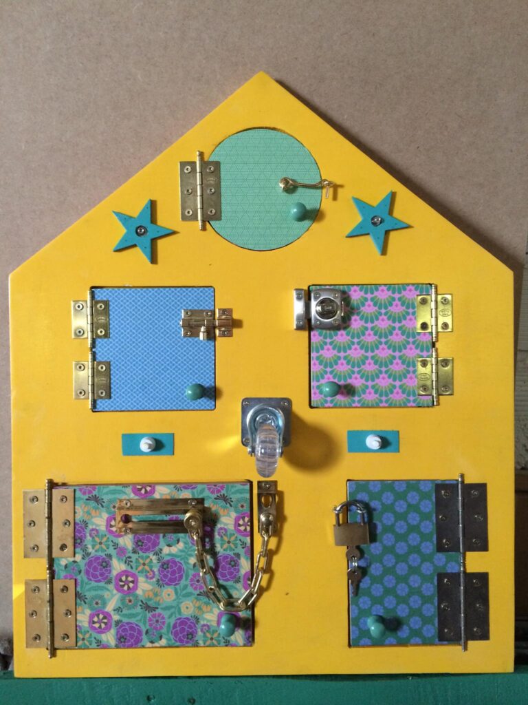This interactive toy features various activities (locks, buttons, textures) that stimulate fine motor skills and problem-solving. Whether store-bought or custom-made, it encourages independence and sensory exploration.