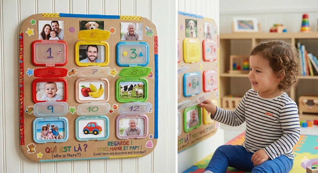 Here’s a fun and interactive idea: a “peek-a-boo” activity board made from cardboard, wipe lids, and pictures. The flaps let your little one discover familiar faces while having fun.