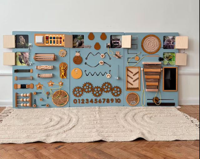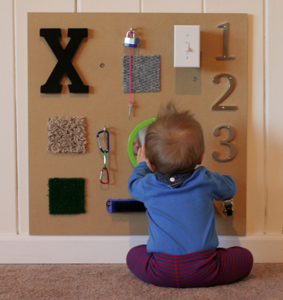 The sensory wall panel is ideal for sensory activities in a room. It promotes a multisensory experience that sparks excitement for playing and learning with locks, latches, buttons, gears, screws, and keys made of metal and wood. A board full of fun that also serves as a creative tool to enhance a child’s learning abilities. It’s a simple activity that will keep your baby stimulated and engaged while also offering many different benefits. Source: Etsy